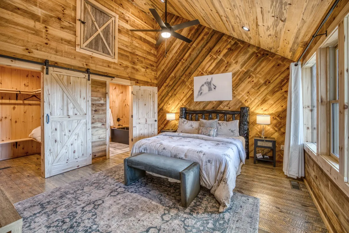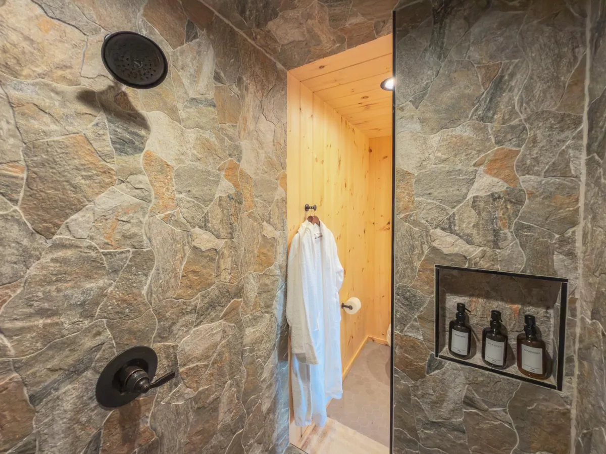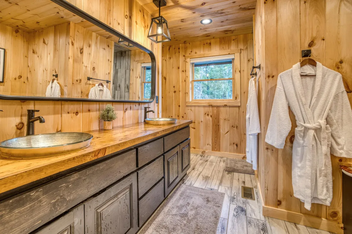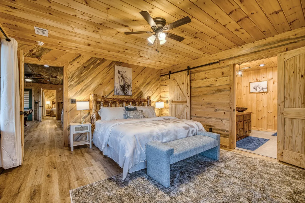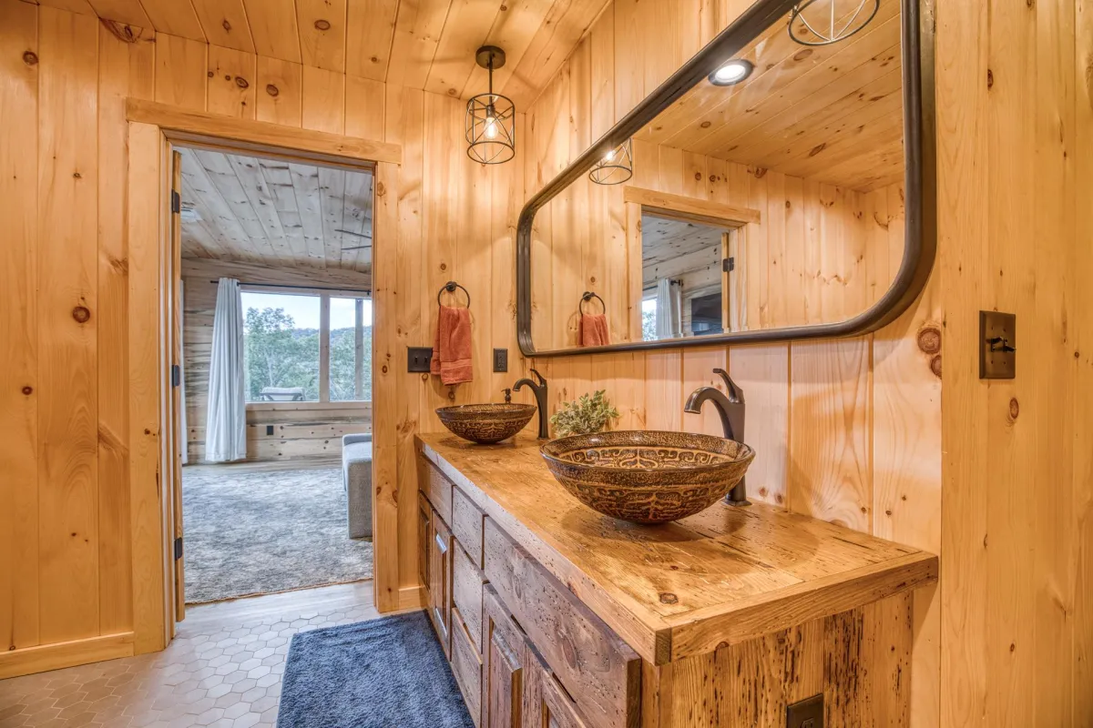 Indulge in the rustic luxury of the primary bathroom. Rejuvenate under the cascading waters of a large, gorgeous stone shower